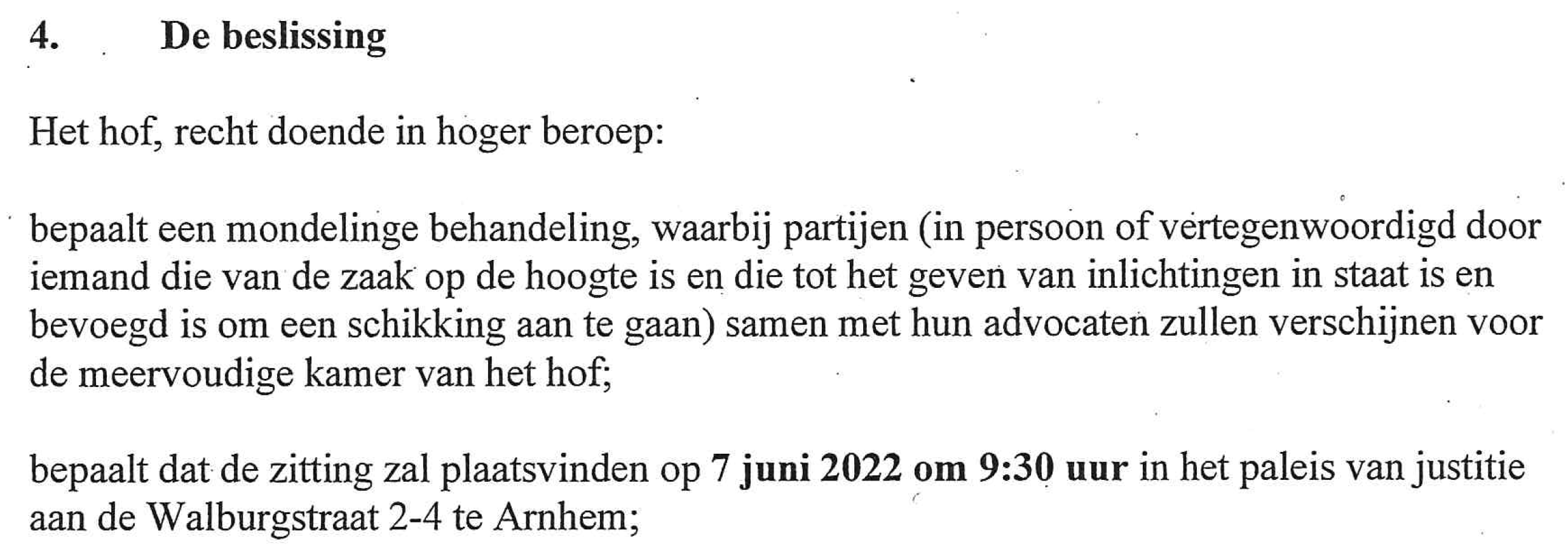 Mondelinge behandeling stelt beide partijen kort in staat hun argumenten persoonlijk toe te lichten aan de 3 raadsheren (waarvan 1 rechter). Tot 10 dagen van tevoren kunnen er nog relevante stukken ingediend worden.
