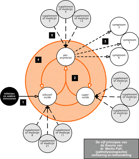 Door deze lekken in de celwand van de energiefabriekjes, veroorzaakt door hele reactieve zuurstof- en stikstofmoleculen ( de zogenaamde vrije radicalen ), functioneren deze fabriekjes niet meer en ontstaan klachten. Met name de produktie van peroxynitriet is de boosdoener.