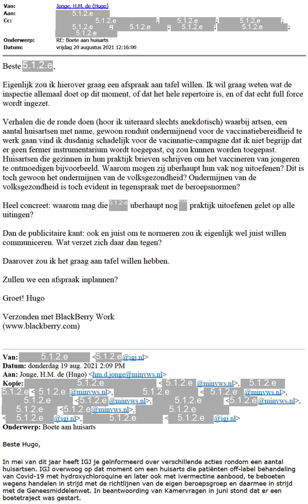 De RvS vindt de bepaling van artikel 68 duidelijk. Dat vinden de artsen ook en dat vindt de minister ook. Ook even voor de duidelijkheid: de inspectie is onderdeel van- en ondergeschikt aan de minister, formeel niet zelfstandig en dus ook niet onafhankelijk. In dit geval had de minister zijn inspectie ook letterlijk opgedragen om de artsen die zijn vaccinatiecampagne “ondermijnden” (de mRNA injecties, “van deur tot deur, van arm tot arm”) full force aan te pakken. Dat hebben de artsen dan waarschijnlijk “ondermijnd” door met succes de antivirale middelen voor te schrijven. Daarvoor zijn de boetes toen immers opgelegd. Namens de minister, staat daaronder.
